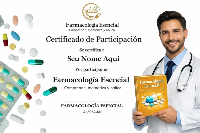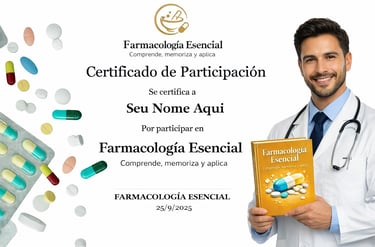 Al finalizar la preparación de Farmacología Avanzada, recibirás tu Certificado de Participación personalizado que avala tus conocimientos en más de 300 fármacos (dosis, contraindicaciones y efectos secundarios).